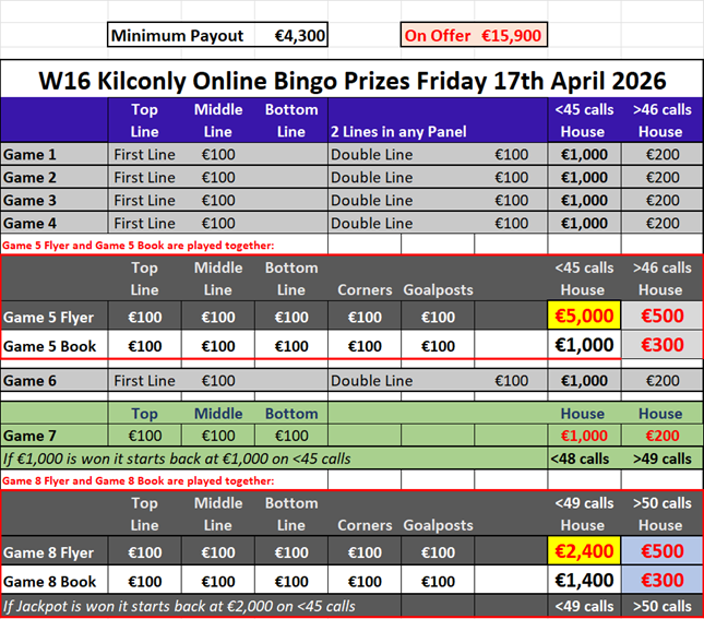 Welcome to Kilconly online Bingo, Watch this short video to learn how easy it is to play Kilconly Online Bingo, and remember onece your order books they are valid for the date stamped on the top of each page, and if you are not able to join our live game and your book has a win, you can still collect your prize, check out our Results Page we will email you and let you know how to claim your prize.