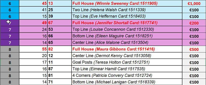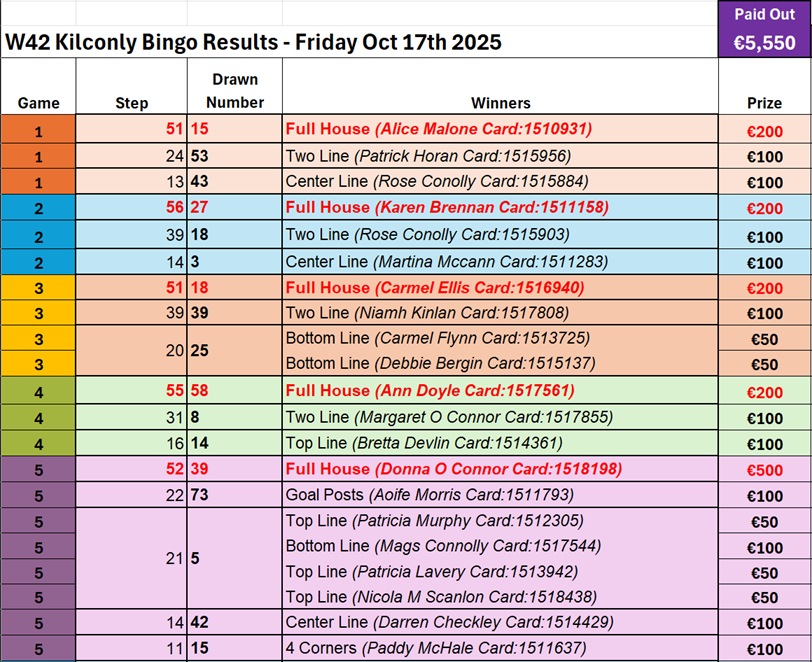 Here is the results and winners list from Kilconly Bingo's recent games: