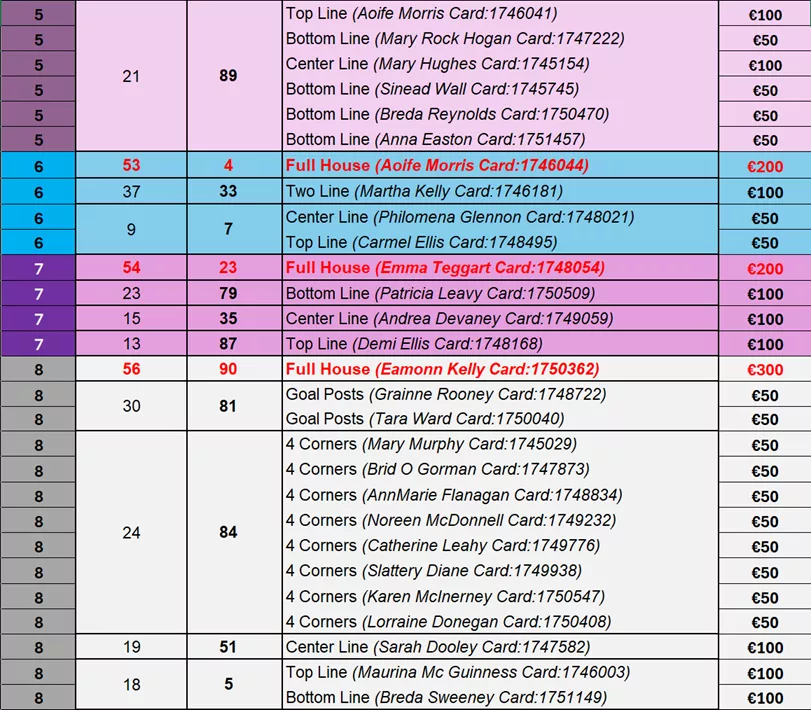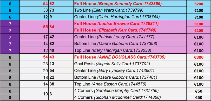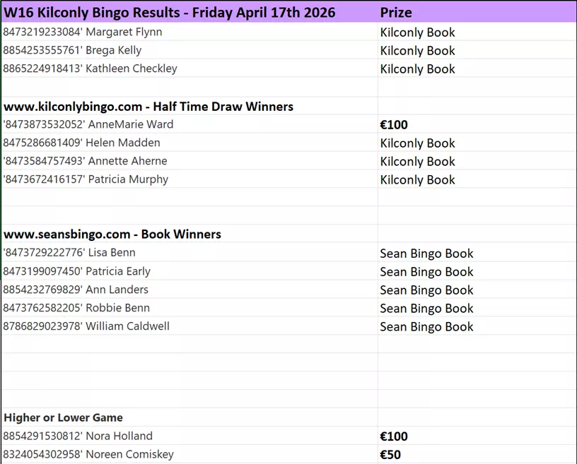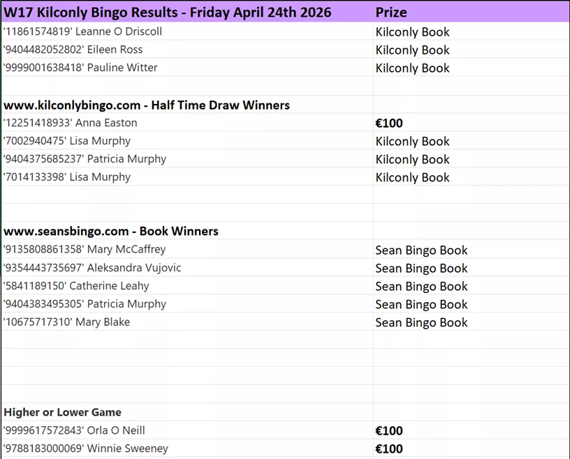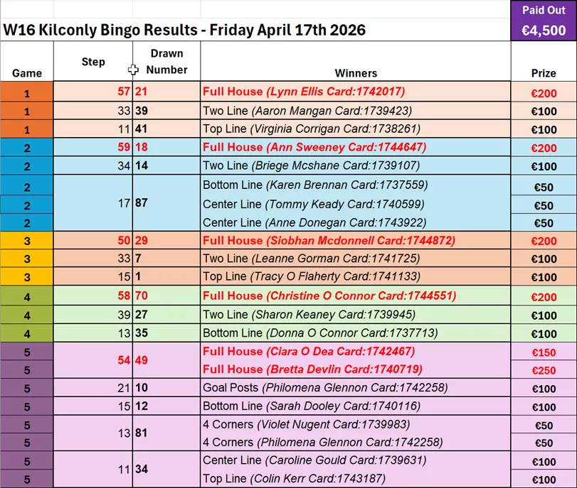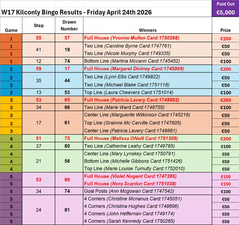 Here are the results and winners' list from Kilconly Bingo's recent games: