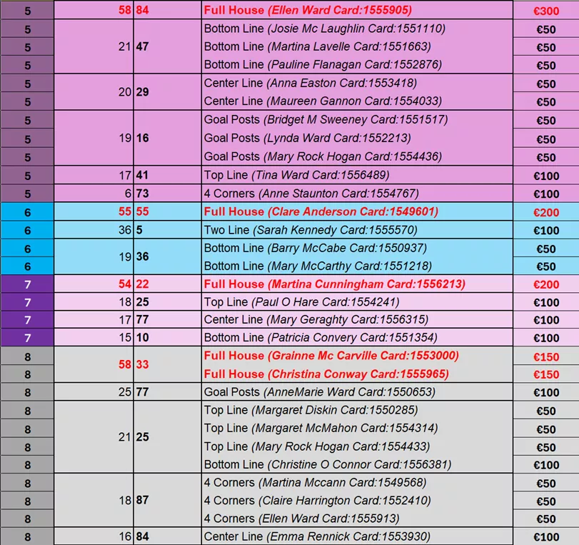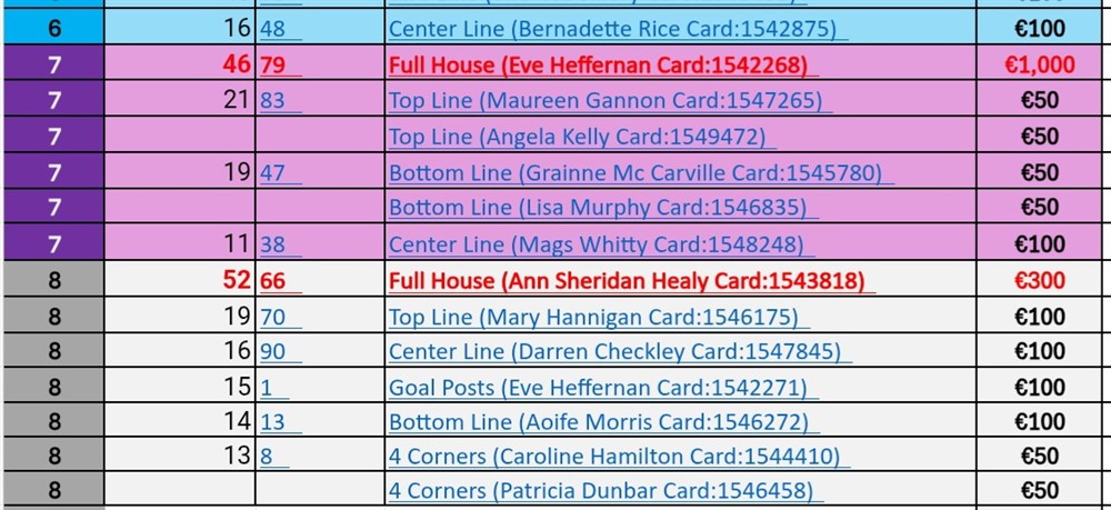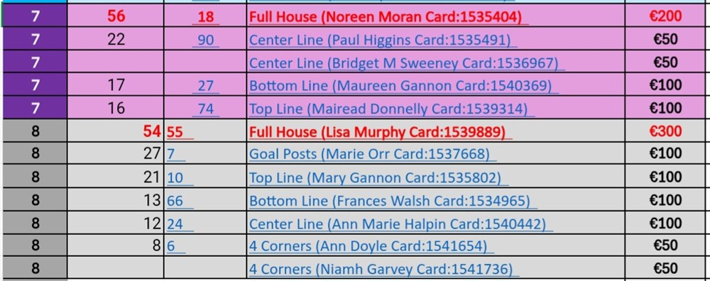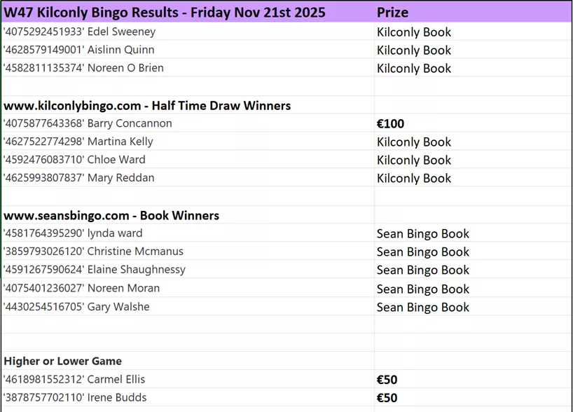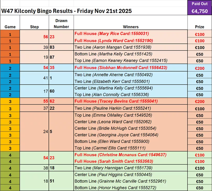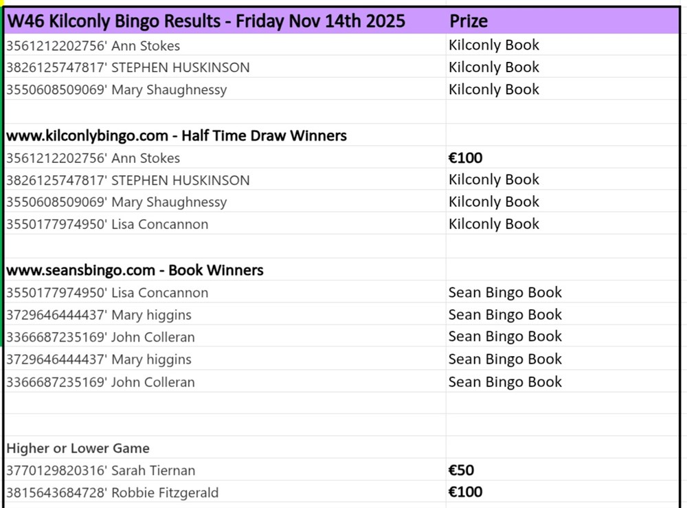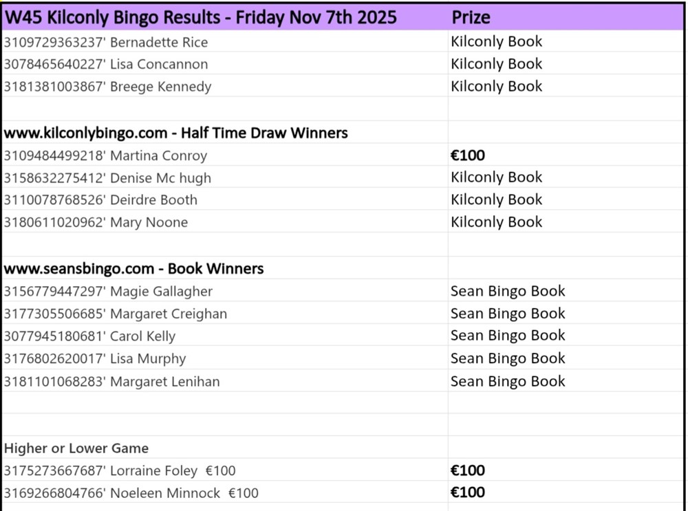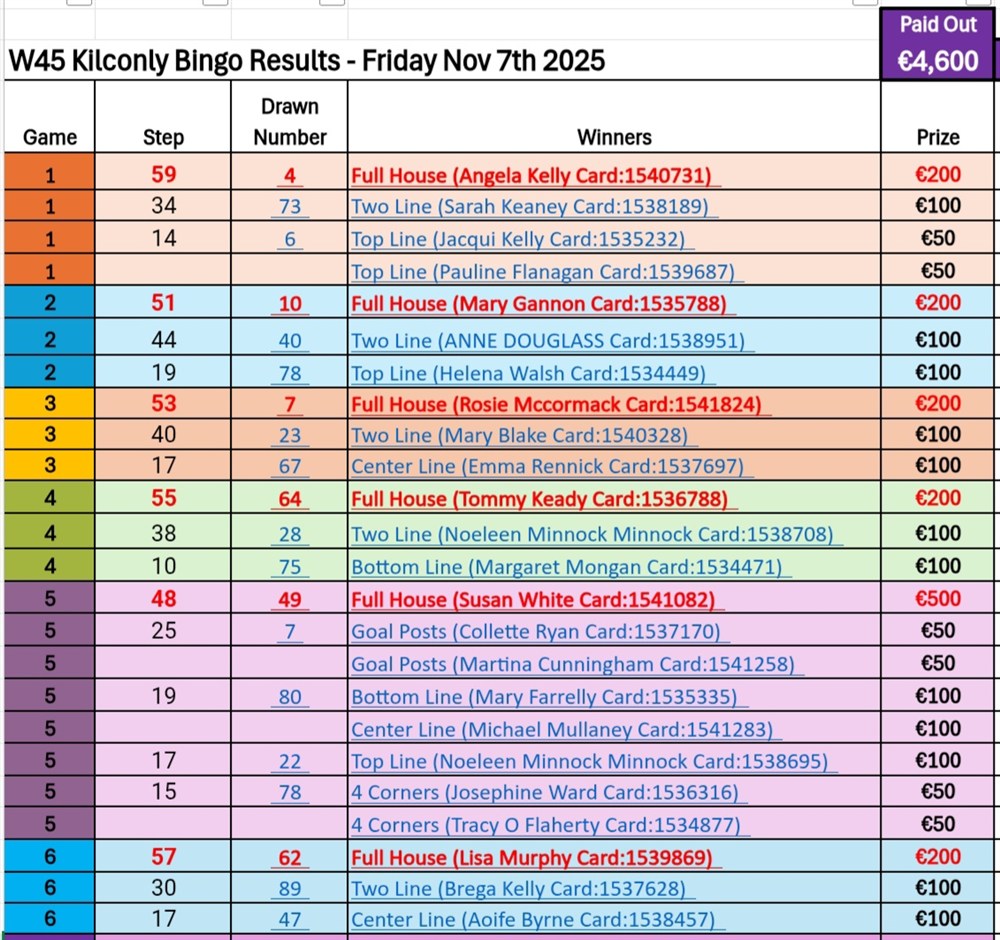 Here is the results and winners list from Kilconly Bingo's recent games: