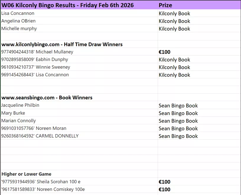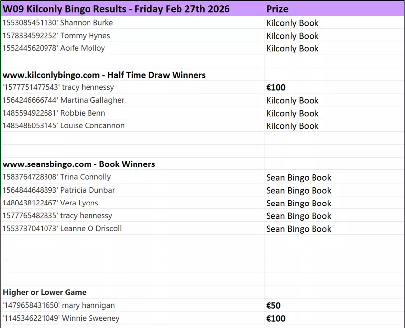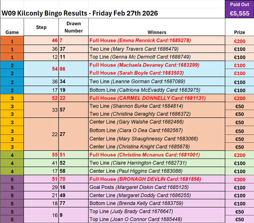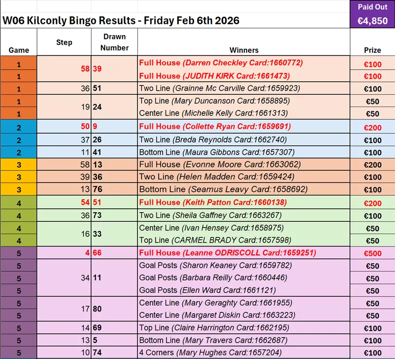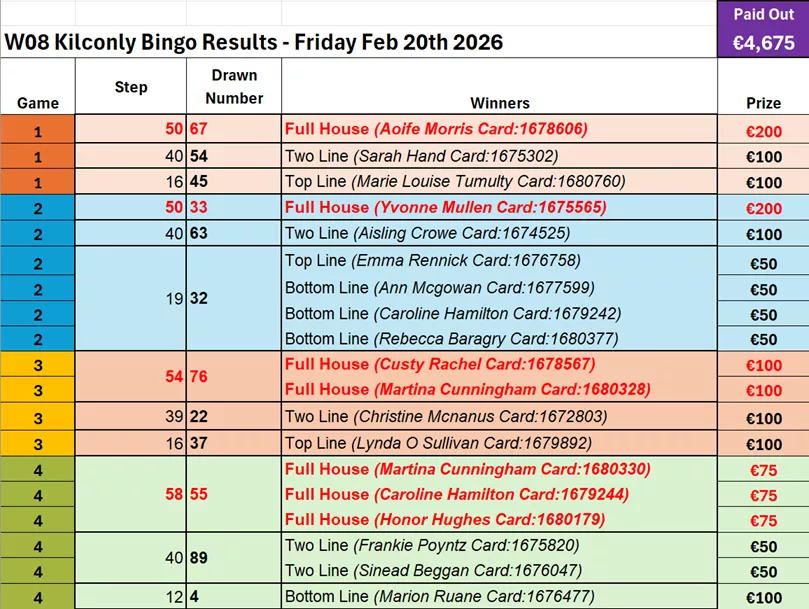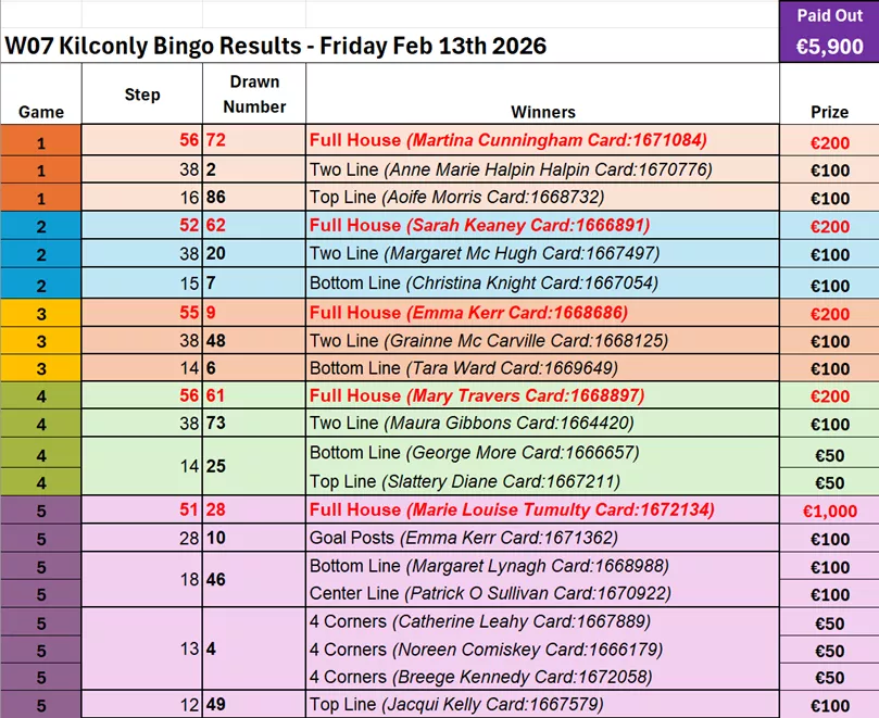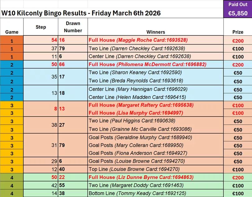 Here are the results and winners list from Kilconly Bingo's recent games: