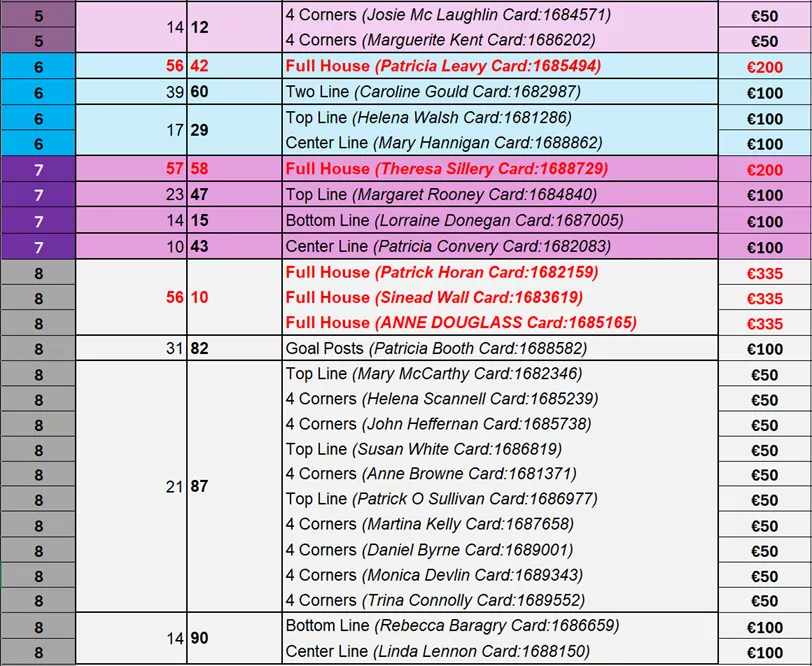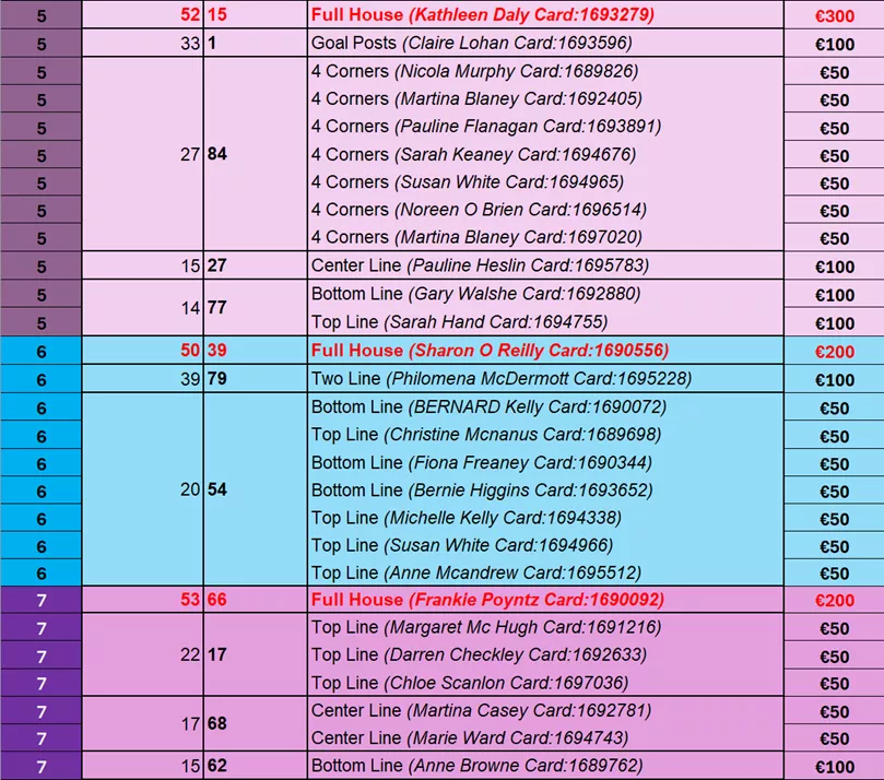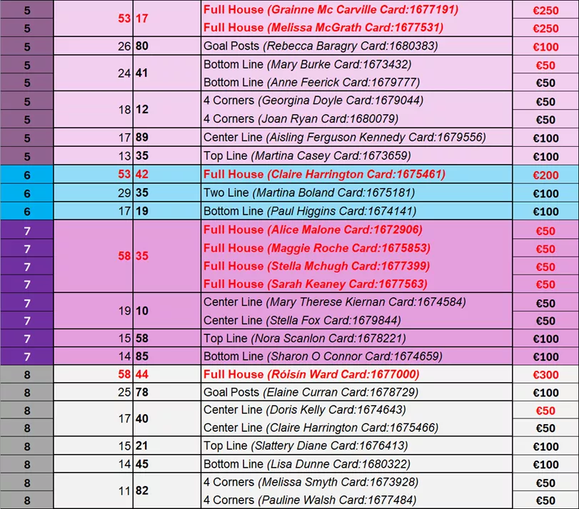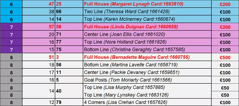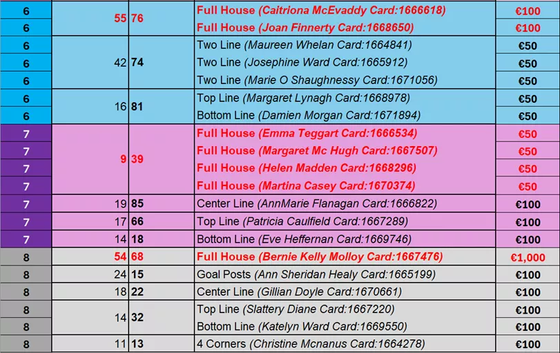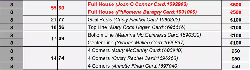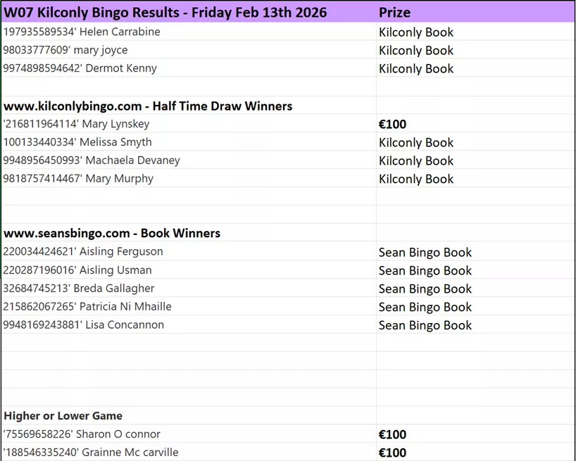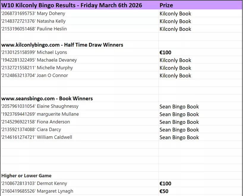 Here are the results and winners list from Kilconly Bingo's recent games: